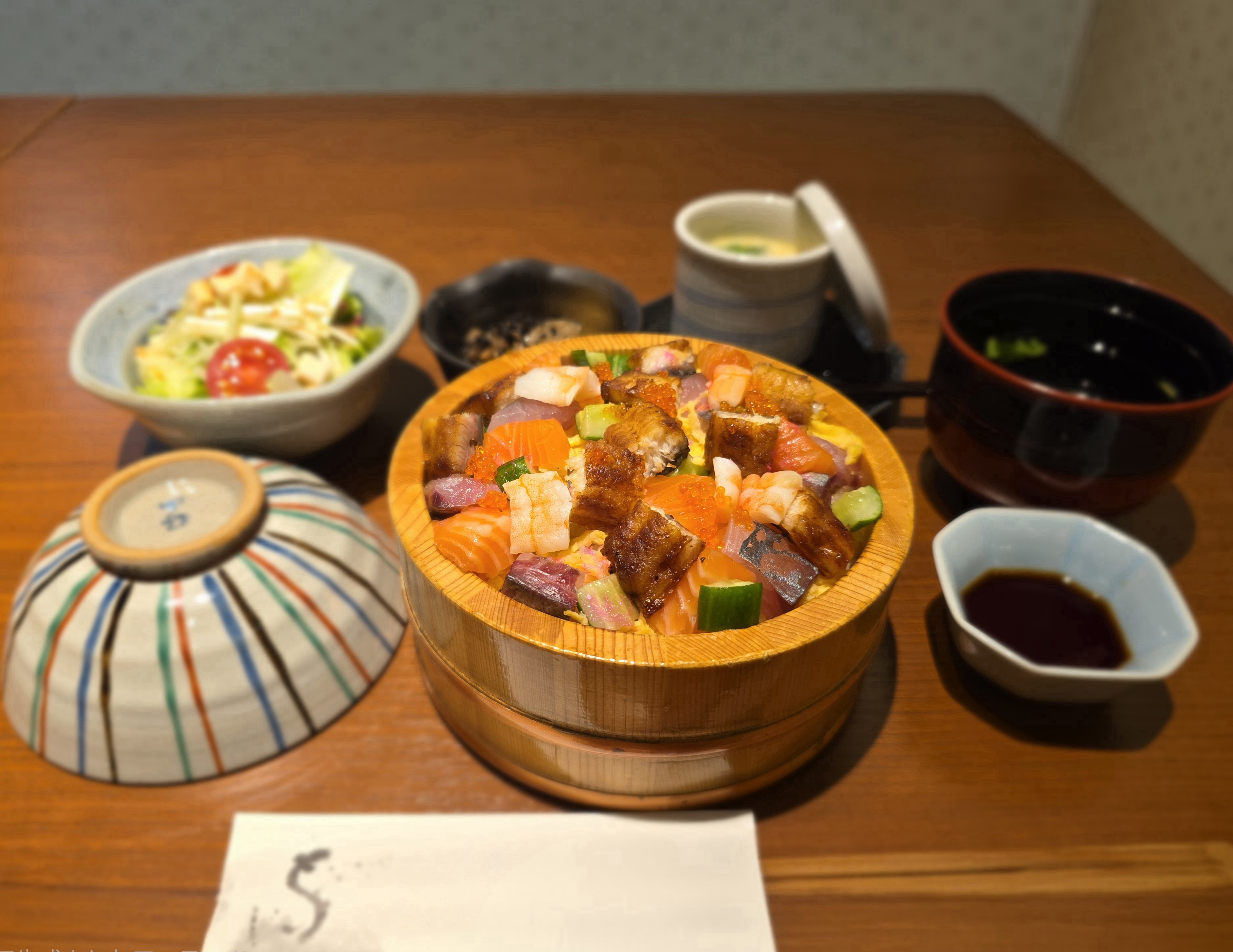 メニュー内容:ミニサラダ、小鉢、茶碗蒸し、吸い物、うなぎちらし